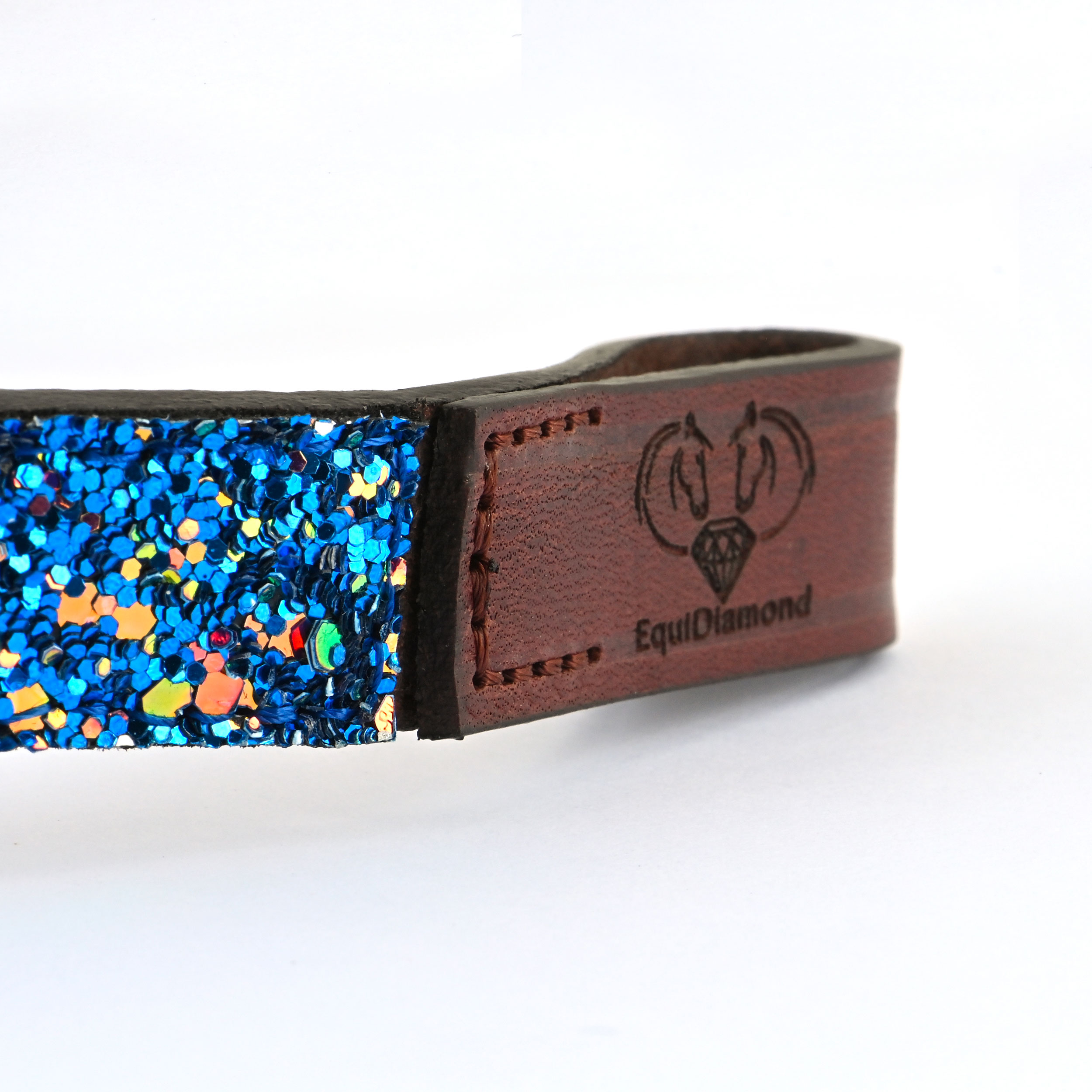 Une base en cuir italien marron ou noir agrémentée de strass pailletés bleu nuit.